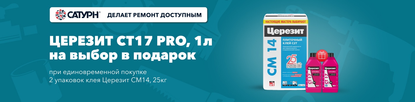 При единовременной покупке 2 упаковок клея ЦЕРЕЗИТ CM14 для плитки, керамогранита и камня, 25 кг., Вы получаете 1 упаковку грунтовки ЦЕРЕЗИТ СТ17 PRO, 1л или ЦЕРЕЗИТ СТ17 PRO (морозостойкая), 1л в подарок!