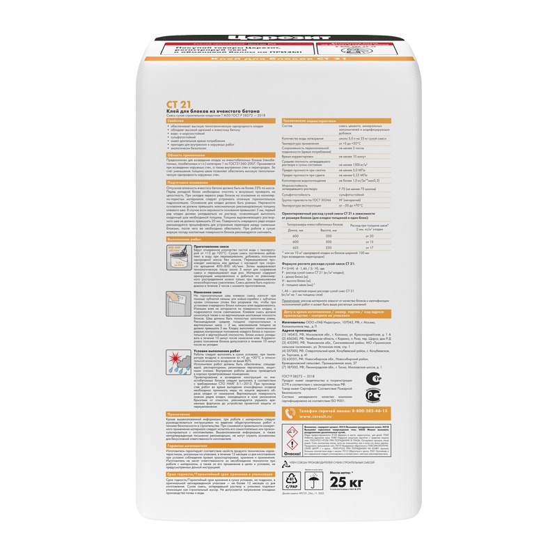 Клей для кладки блоков из ячеистого бетона Церезит CT 21 зима, 25 кг
