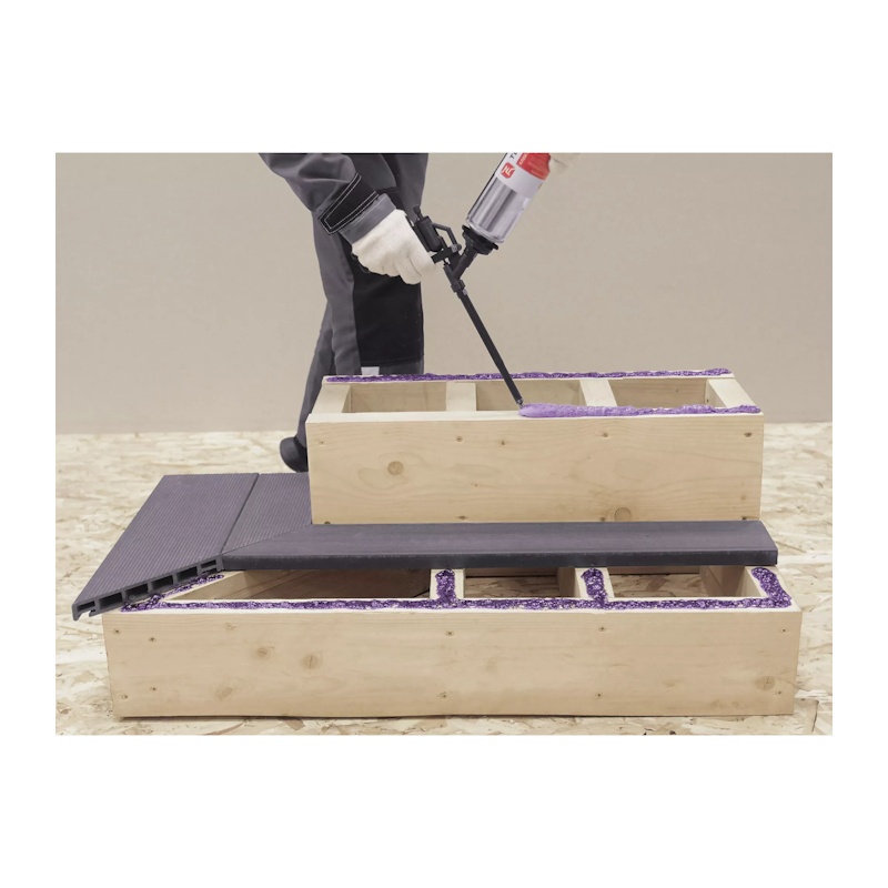 Не имеет вторичного расширения, после выпуска из баллона оседает, образуя вязкую клеевую массу. Обладает хорошей устойчивостью к влажности, плесени, старению, высокой адгезией к дереву, древесно-стружечным плитам, плитам OSB, мозаичной облицовке, а также бетону, цементным штукатуркам и другим основаниям. Не оказывает давления на склеиваемые элементы.