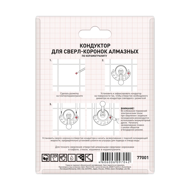 В строительном магазине Сатурн можно купить товар "Кондуктор для сверл-корон. алмаз. по керамогр. Trigger 77001 4-12мм" по цене от 859 руб с доставкой за 2 часа по Тольятти или оформить самовывоз.