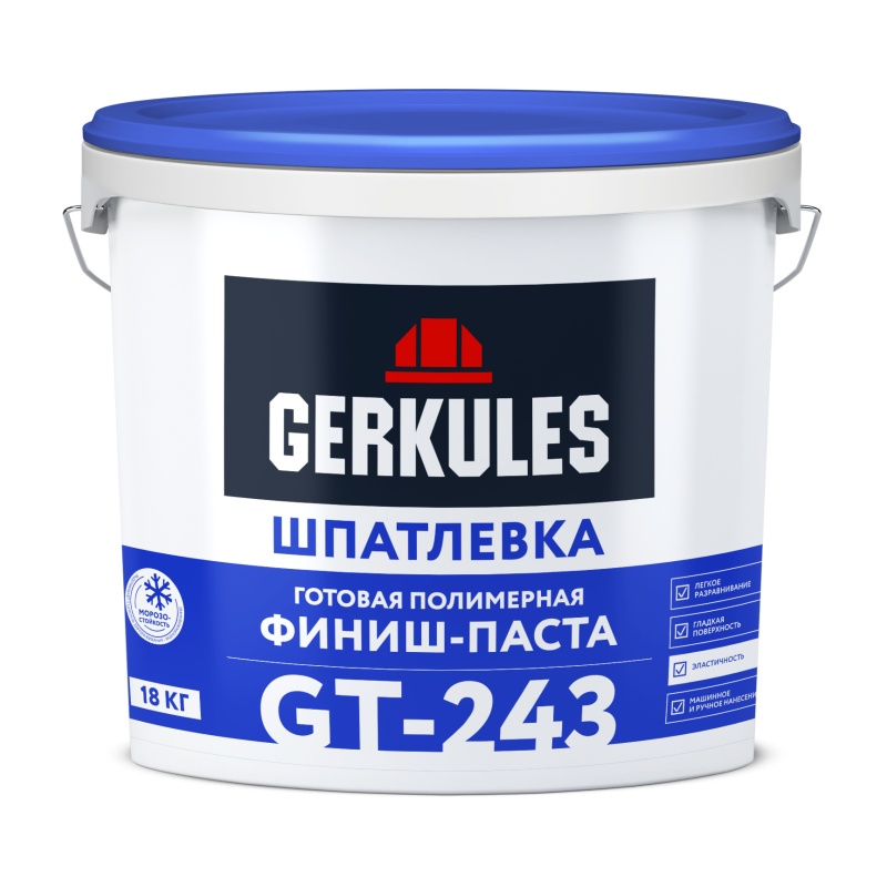 Шпатлевка полимерная Gerkules GT-243 Финиш-Паста - готовая к применению финишная пастообразная полимерная шпатлёвка. Используется для финишного выравнивания поверхностей стен и потолков в сухих помещениях под дальнейшую отделку, а также для приклеивания стеклохолста. Поверхность основания после высыхания имеет белый цвет, что способствует снижению расхода красок при окрашивании. Шпатлевка может наноситься как вручную, так и механизированным способом. Применяется внутри помещений.