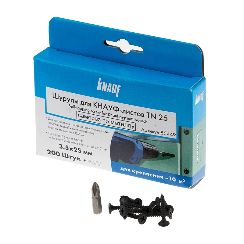 Предназначен для крепления гипсокартонных КНАУФ-листов (ГКЛ, ГКЛВ, ГКЛВО) к каркасу из металлических профилей (толщина стенки до 0,7 мм). Не требует предварительного засверливания. Обеспечивает высокое качество готовой поверхности и соблюдение технологии КНАУФ при монтаже гипсокартонных КНАУФ-листов (ГКЛ, ГКЛВ, ГКЛВО).