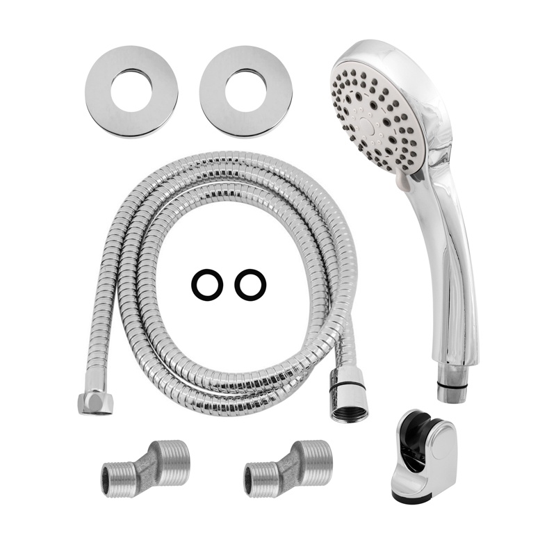 Комплектация: смеситель, металлизированный шланг для душа в пластиковой оплетке 1.5 м, душевая лейка (диаметр 95 мм) 5 режимов, пластиковый держатель для лейки, комплект крепежа, эксцентрики, составные декоративные накладки, паспорт изделия.