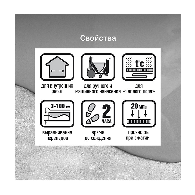 • Смесь: сухая напольная самовыравнивающаяся Рк5, В12,5 Вtb3,2 по ГОСТ 31358-2019.